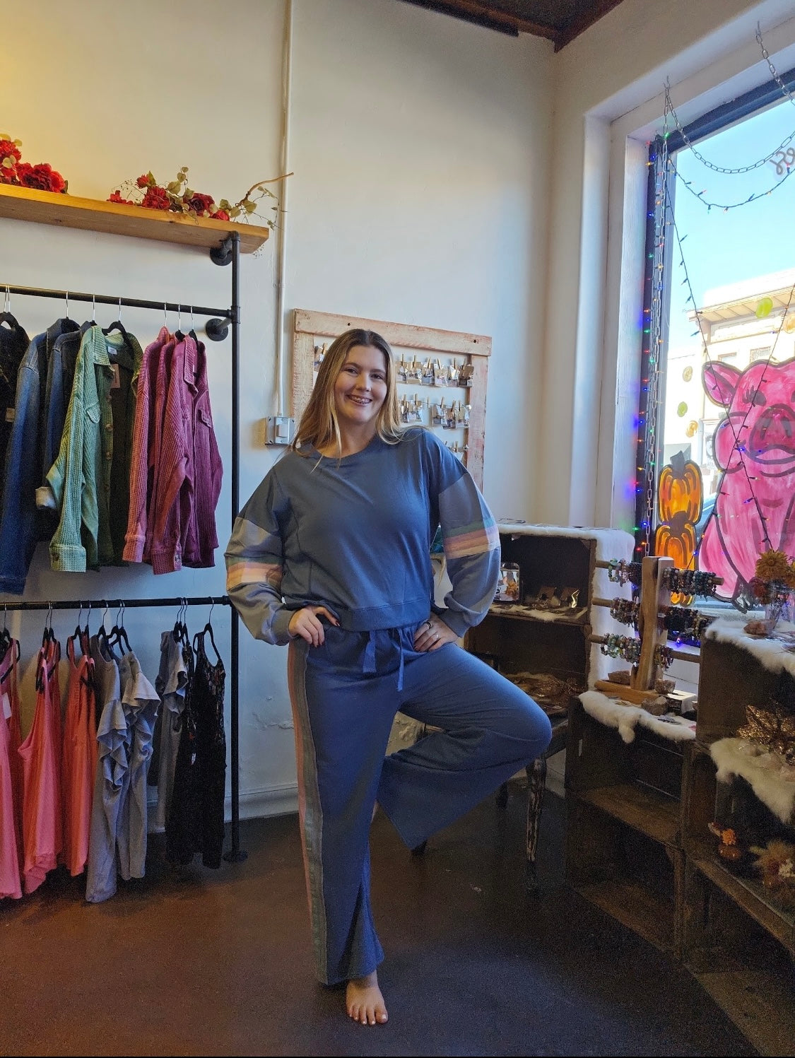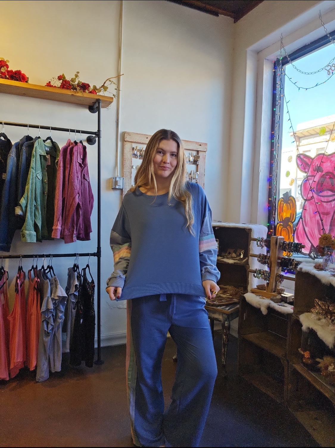 Top: An oversized fit with drop shoulders, long sleeves, and a round neckline finished with a ribbed hem for that easy, relaxed feel.