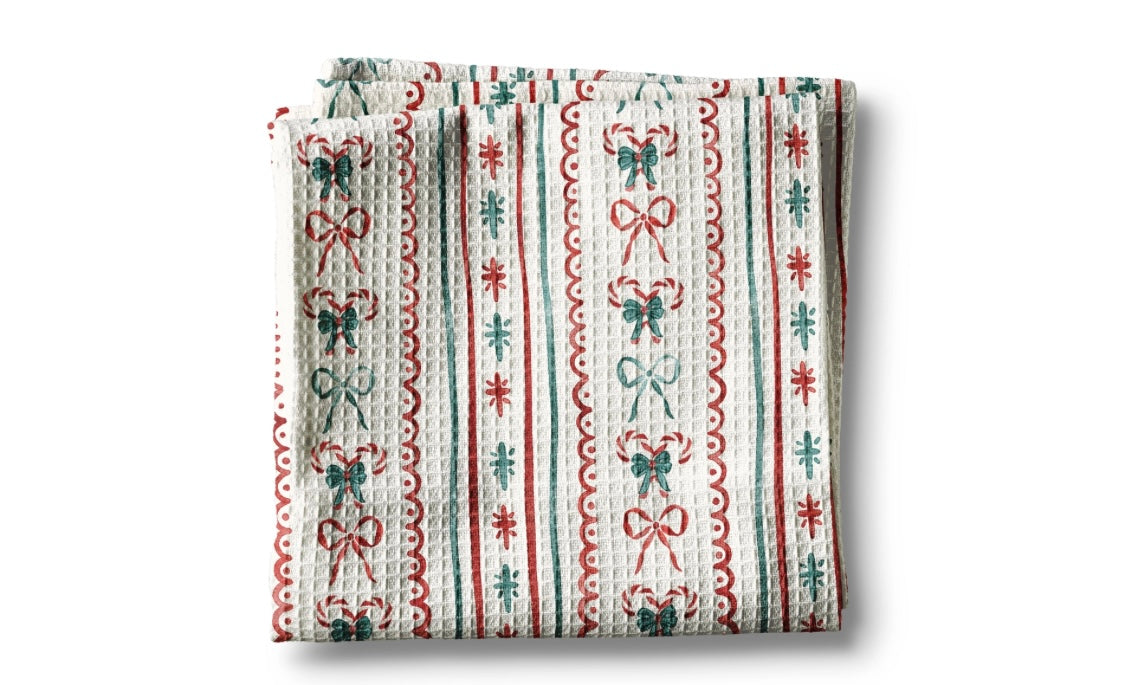 The perfect preppy addition to your classic Christmas decor! These towels are perfect home and kitchen decor, and also makes a great holiday gift. A nice addition to real estate closing, housewarming, and hostess gifts. - Measures approximately 16”x 24” - Made of 80% Polyester and 20% Polyamide. - Design is permanently printed - Single side across whole towel - Individually packaged in cellophane sleeve and ready to be gifted - It is called a waffle weave because the towel has raised looped edges on the surface of the towel in the shape like that on a delicious Belgian Waffle. These “pockets'' that are created hold water while the surface of the cloth stays dry making it an exceptional drying towel! The raised looped edges on this lint free towel make it great for all around use, while also being great on glass. floral christmas ornament preppy bow whimsical pink swirly fun unique blue