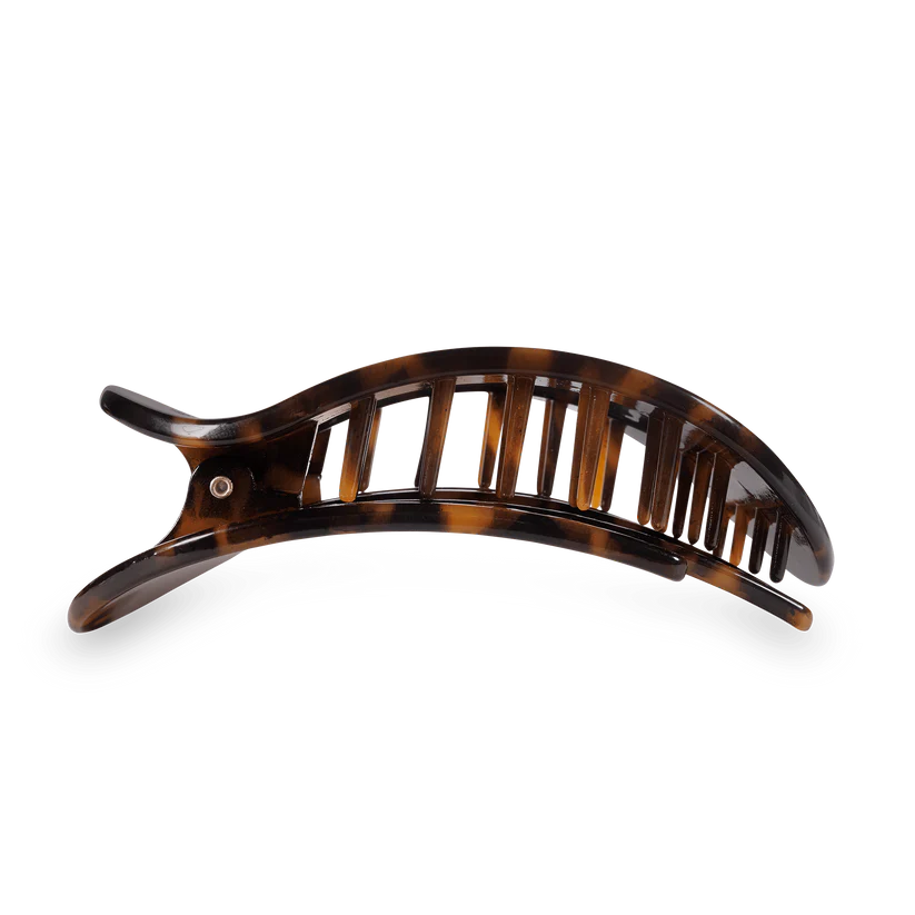 Lay flat and relax with the new TELETIES Tortoise Medium Flat Round Hair Clip. This hair clip is designed to allow you to lay back flat, do yoga, or sit comfortably in a seat with a headrest, and it is made with the same material that is nearly unbreakable.